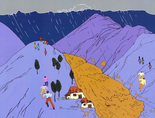 4、出现泥石流后,要马上与泥石流成垂直方向向两边的山坡上面爬,爬得越高越好,跑得越快越好,绝对不能往泥石流的下游走。